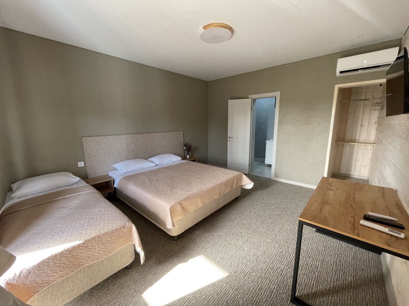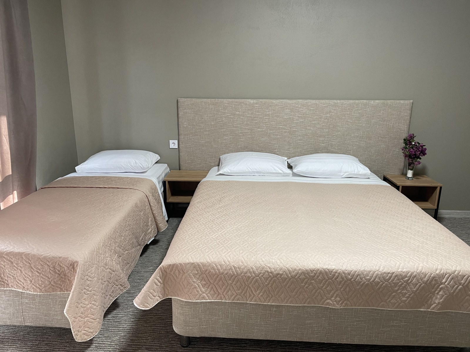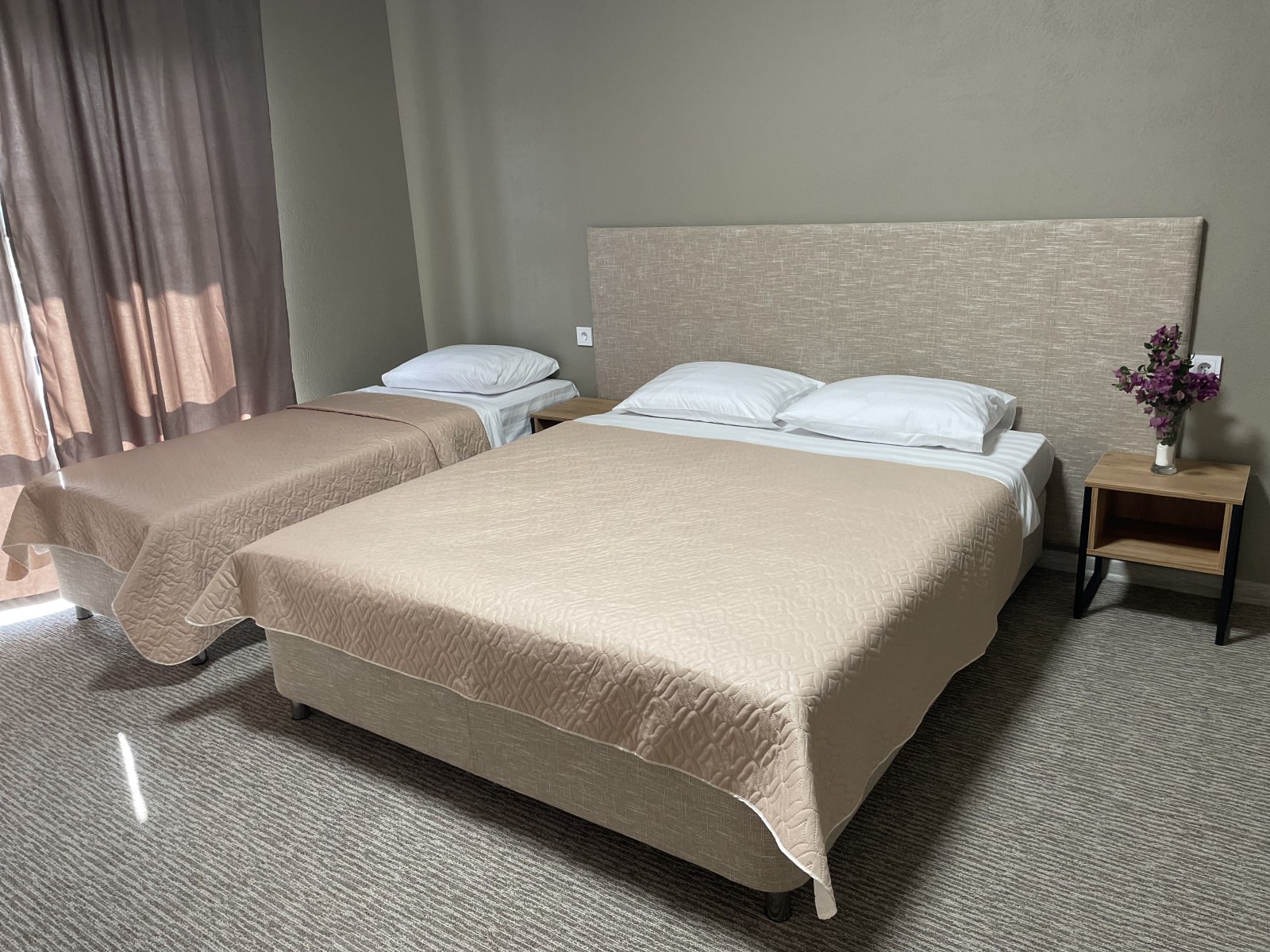 Площадь номера - 25 кв.м. 3 осн. места. 1 доп. место. Мебель: вешалка, зеркало, кровать двуспальная, кровать односпальная, прикроватные тумбочки, стол, шкаф. Оборудование: кондиционер, набор посуды, телевизор, холодильник, электрочайник. Санузел: с душем, туалетные принадлежности, фен. Сервис: Wi-Fi бесплатно, смена полотенец, смена постельного белья, уборка номера.