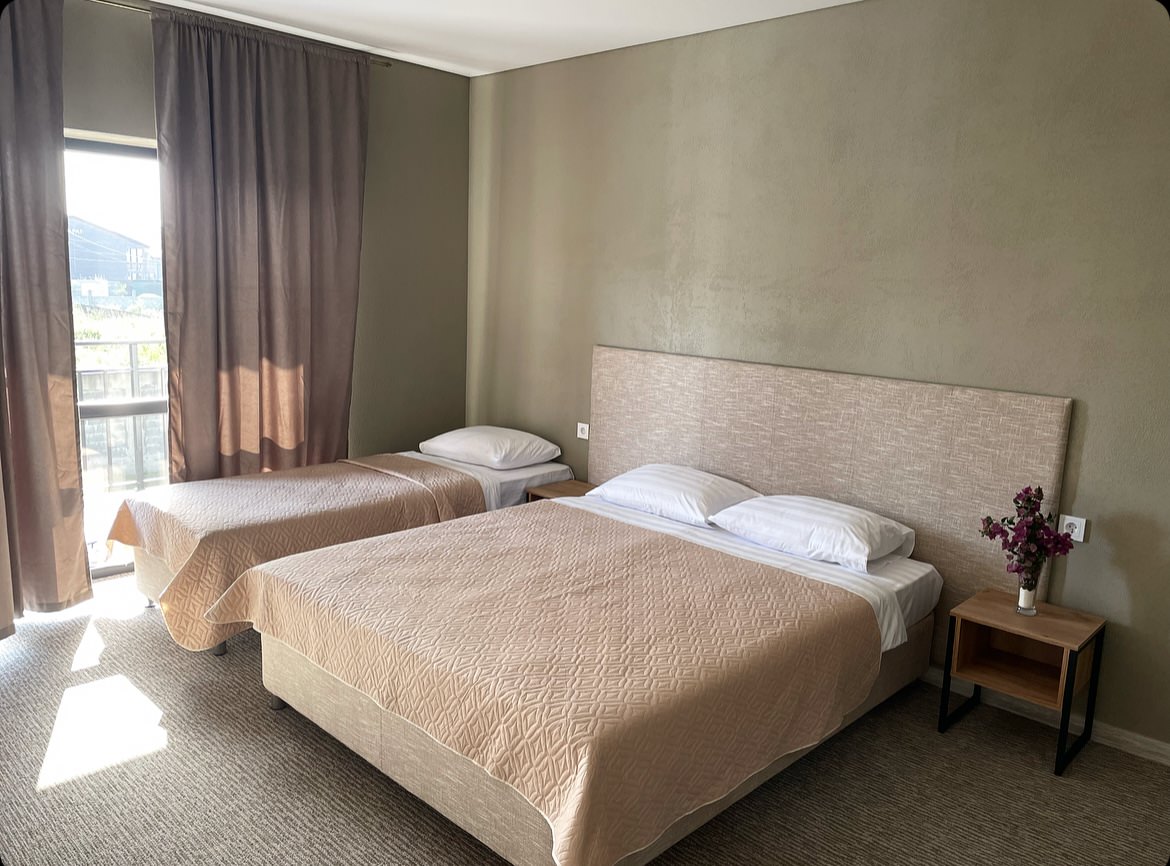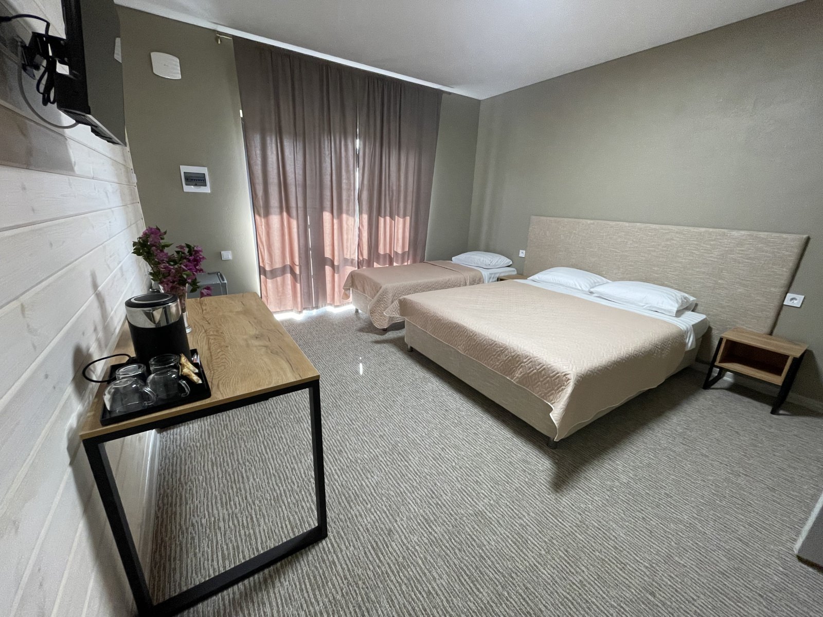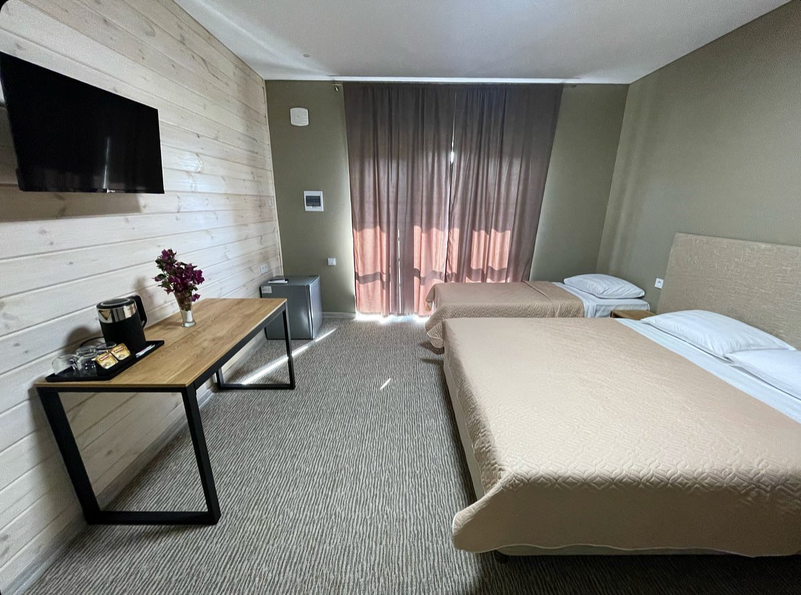 Площадь номера - 25 кв.м. 3 осн. места. 1 доп. место. Мебель: вешалка, зеркало, кровать двуспальная, кровать односпальная, прикроватные тумбочки, стол, шкаф. Оборудование: кондиционер, набор посуды, телевизор, холодильник, электрочайник. Санузел: с душем, туалетные принадлежности, фен. Сервис: Wi-Fi бесплатно, смена полотенец, смена постельного белья, уборка номера.